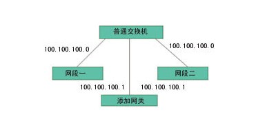 我們假定這個網絡由兩個網段組成:網段一的網絡地址是100.100.100.0,掩碼是255.255.255.0;網段二的網絡地址是100.100.101.0,掩碼也是255.255.255.0。計算機通過普通交換機相連,現在希望這兩個網段能互相訪問。顯然,這時不能用VLAN將它們隔開。