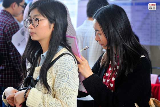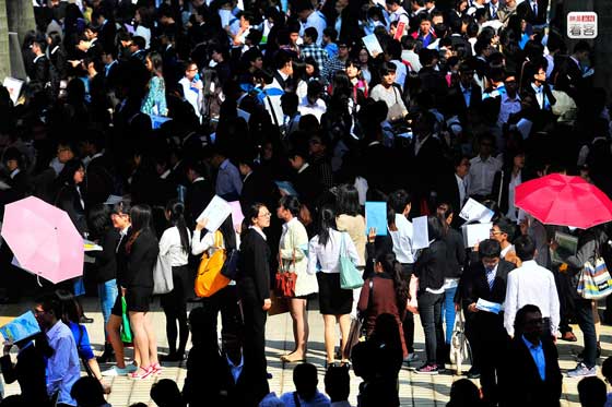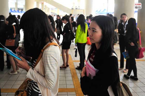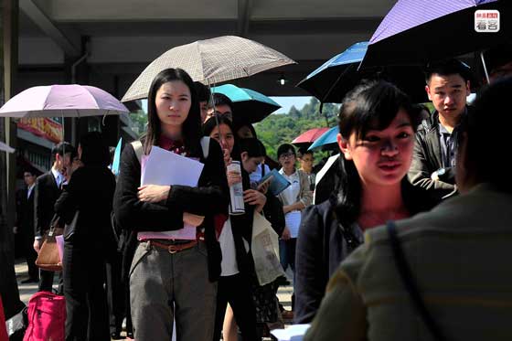 2013年底,在確定了自己不考研究生之后,中國礦業大學2014界畢業生黎影走上了求職道路。2013年11月,黎影從徐州前往廣州參加招聘會,招聘會上黎影排隊等待與招聘人員交流。