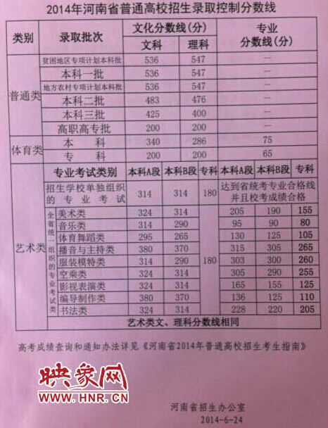 6月24日下午,2014年河南高考分數線公布:理工類:一本547分、二本476分、三本400分、專200,體育本286、專200。文史類:一本536分、二本483分、三本425分、專200,體育本340、專200。
