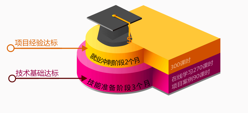 第一個階段為"技能準備階段",為期3個月;第二個階段為"就業(yè)沖刺階段",為期2個月。第一個階段通過精心設計的知識、技能點訓練重點提升學員的專業(yè)技術能力,使每個學員的技術技能達到可動手實戰(zhàn)項目的水平。第二個階段將通過實戰(zhàn)項目重點增加學員的項目經(jīng)驗和工作經(jīng)驗,向就業(yè)發(fā)起沖刺,實現(xiàn)就業(yè)對接。