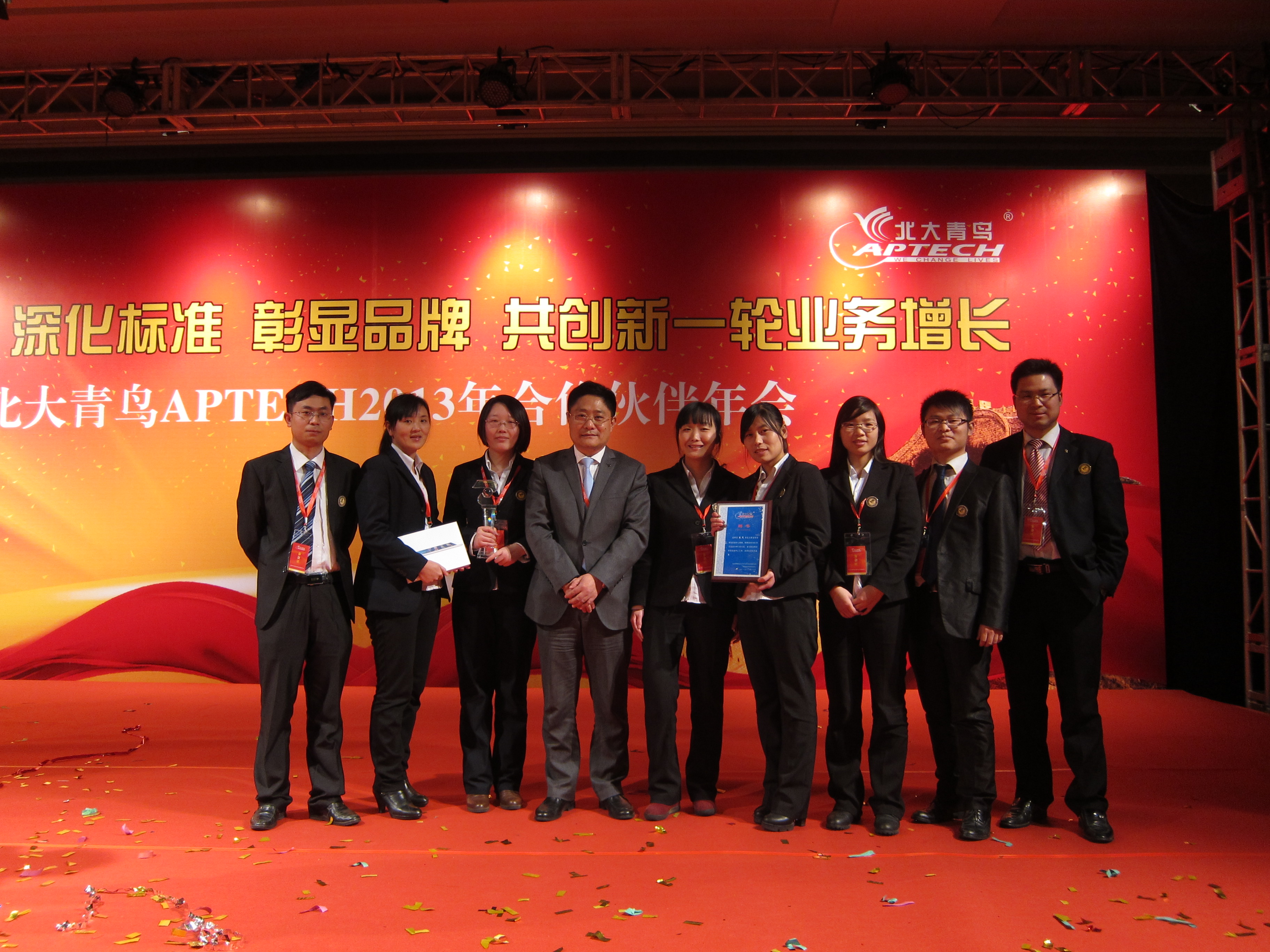 “耕耘獎”就是北大青鳥APTECH為表彰先進、樹立典范,面向全國200多家北大青鳥中心進行逐級評選,旨在表揚近年來成績一直在進步的中心。2013年全國百家校區的評選,有逾兩百家中心參選,而最終僅有四家校區獲此殊榮,翔天信鴿能位列其中,由此可見我校實力,同時這也是整個翔天信鴿團隊的榮光!