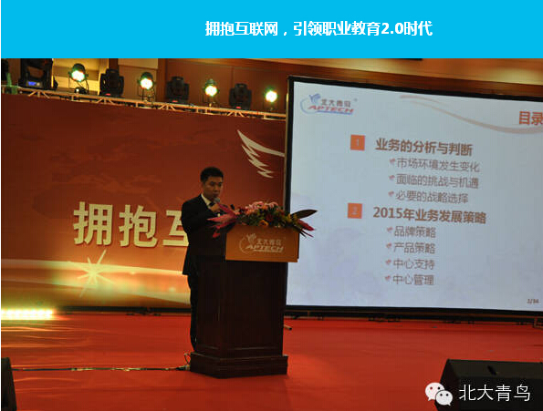 下午會議以北大青鳥APTECH 副總裁陳峰波陳總的報告開始。他的報告主題是:擁抱互聯網,引領職業教育2.0時代。闡述了2015年公司的整體戰略及未來的發展規劃。